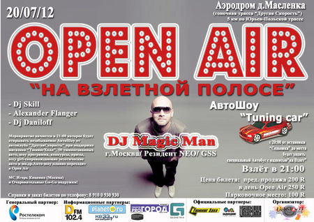 open air "На взлетной полосе" 20 июля 2012, пятница Прочее Начало в 21.00 место проведения: Аэродром д. МасленкаОткрывает мероприятие незабываемое АвтоШоу от Автоклуба "Другая скорость" при поддержке магазина "ТюннингХолл". 50 тюннингованных авто, шоу программа, конкурсы, призы, sexy girl, сопровождающие экзотические авто.Dj Magic ManDj SkillAlexander FlangerDj DaniloffМС Игорь Киценко (Москва) и очаровательные Go-Go подружки!с 20:00 от ост. Содышка до места будет ходить специальный автобус с надписью "На взлет"Справки и заказ билетов по тедефону: +7 910 0 930 930Цена билета:предпродажа 200рв день Open Air 250рпарковочное место: 100р Просмотров: 598